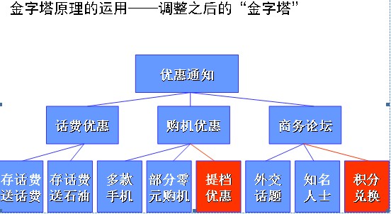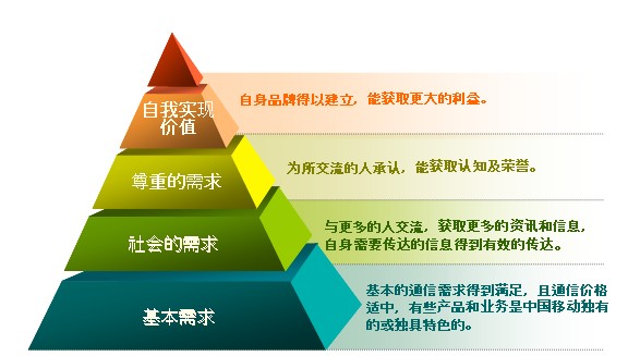 慧聰鄧白氏研究認(rèn)為,客戶(hù)在使用通信產(chǎn)品的時(shí)候也大致可分為四個(gè)需求層次,第一層是基本需求,如基本的通信需求(電話(huà)/短信)得到滿(mǎn)足,且價(jià)格適中,有些產(chǎn)品和業(yè)務(wù)是中國(guó)移動(dòng)獨(dú)有的或獨(dú)具特色的;第二層是社會(huì)的需求,(使用中國(guó)移動(dòng))與更多的人交流,獲取更多的資訊和信息,且自身需要傳達(dá)的信息也得到有效的傳達(dá);第三層是尊重的需求,即為所交流的人承認(rèn),能獲知認(rèn)知及榮譽(yù);第四層是自我實(shí)現(xiàn)價(jià)值的需求,即(通過(guò)使用移動(dòng)通信業(yè)務(wù))自身品牌得以建立,能獲取更大的利益。