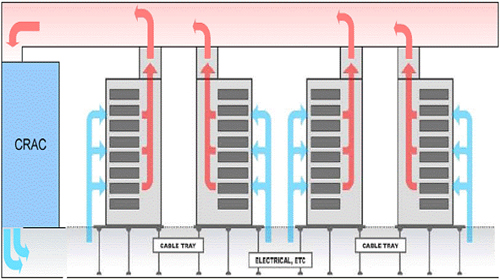 追求更低前期成本和更高運(yùn)行效率的公司可以安裝被動(dòng)式冷卻系統(tǒng)。它們的機(jī)殼上裝有一個(gè)氣密的后門和煙囪,用于收集來自服務(wù)氣的熱排風(fēng),并將其直接引導(dǎo)至CRAC裝置上的回風(fēng)管道中。然后,CRAC裝置對排風(fēng)進(jìn)行冷卻并重新循環(huán)。被動(dòng)式系統(tǒng)要求機(jī)柜從前到后都具有較強(qiáng)的氣密性,以便與由CRAC裝置進(jìn)入的冷風(fēng)混合的服務(wù)器熱風(fēng)盡量少。通過比普通的熱-冷通道技術(shù)更徹底地分離冷風(fēng)和熱風(fēng),設(shè)計(jì)合理的被動(dòng)式冷卻系統(tǒng)甚至能以低成本使灼熱的30kW服務(wù)器機(jī)柜在安全溫度下運(yùn)行。