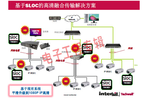 革命性的Intersil Techwell SLOCTM(Security Link over Coax)同軸電纜復(fù)合視頻傳輸解決方案是可通過一條同軸電纜同時傳輸模擬 CVBS 視頻和高清數(shù)字 IP 視頻信號的先進(jìn)調(diào)制解調(diào)器解決方案,其采用最新MODEM PHY技術(shù)的傳輸解決方案,可以基于同軸電纜同時傳輸高清IP碼流和標(biāo)清模擬實時視頻。