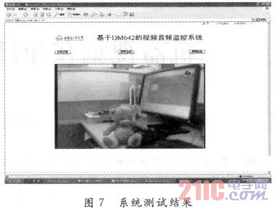 在集成開發(fā)環(huán)境CCS(C6000)下,加載相關(guān)驅(qū)動程序,對本系統(tǒng)進行了測試。CCD攝像頭為標準PAL制式,圖像采集的幀頻為25幀/s,圖像的分辨率為720×576像素。測試結(jié)果如圖7所示。測試結(jié)果表明,網(wǎng)絡連接正常,用戶在PC端可通過瀏覽器訪問系統(tǒng),成功實現(xiàn)遠程監(jiān)控。
