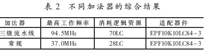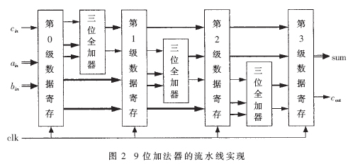(2)針對(duì)不同運(yùn)算的位寬需要,設(shè)計(jì)專(zhuān)用的加法器和乘法器。本文對(duì)整數(shù)變換中的加法器采用三級(jí)流水線加法器,實(shí)現(xiàn)9位加法,每級(jí)流水線完成三位超前進(jìn)位加法,將邏輯延遲限制在三位加法器之內(nèi)。圖2給出了9位加法器的流水線實(shí)現(xiàn)框圖。選用EPF10K10LC84-3作為適配器件,經(jīng)過(guò)Synplify Pro 7.3綜合,結(jié)果表明這種加法器具有較優(yōu)的最高工作頻率和硬件開(kāi)銷(xiāo)。如表2所示, 常規(guī)加法器的最高工作頻率為37.0MHz,消耗資源卻為28LC,而經(jīng)過(guò)優(yōu)化的三級(jí)流水線加法器在消耗資源增加不多的情況下,其最高工作頻率相比常規(guī)加法器提高了257%,達(dá)到94.5MHz。