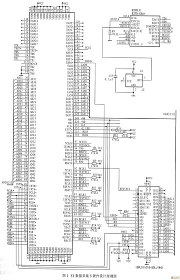 BT8474是一個PCI多功能設備。本系統(tǒng)中,其功能0實現(xiàn)鏈路層的控制;功能1完成物理層的控制。BT8474是由1個主接口、4個串口、1個EBUS端口和1個邊界掃描口構成。主接口通過PCI的兩個功能配置區(qū)找到基地址寄存器,系統(tǒng)根據(jù)訪問的地址值決定選擇的功能;串行接口完成主接口和物理接口器件的數(shù)據(jù)傳輸;EBUS端口通過內(nèi)置的MPU(微處理器單元)來擴展外圍設備,物理接口器件BT8370是一個T1/E1收發(fā)成幀器,可支持LineRate為1.544 Mb/s(T1)或者2.048 Mb/s(E1)的收發(fā)接口。物理線性接口電路恢復來自于電纜的“+3 dB~-43 dB”的模擬時鐘和數(shù)據(jù)。圖1給出了E1數(shù)據(jù)采集卡硬件設計原理圖。