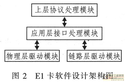 E1采集卡軟件設計架構主要由鏈路層驅動模塊、物理層驅動模塊、應用層接口處理模塊和上層協(xié)議處理模塊組成,如圖2所示。驅動程序是數(shù)據(jù)采集卡的基礎,它負責E1接口數(shù)據(jù)采集和數(shù)據(jù)重組,并通過共享內(nèi)存與PC機實現(xiàn)數(shù)據(jù)交互,以及控制指令動作和硬件狀態(tài)報告等。