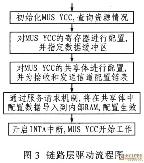 鏈路層HDLC控制器主要完成內(nèi)部寄存器和映射的共享體配置。共享體用于HDLC寄存器的初配、接收和發(fā)送緩沖區(qū)以及時隙映射表的配置。HDLC控制器為每個信道都建立一個消息鏈表,這樣數(shù)據(jù)緩沖區(qū)可以循環(huán)利用。HDLC控制器與成幀器的對應關系決定于HDLC控制器端口映射方式的設置。其配置流程如圖3所示。