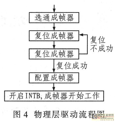 物理層通過地址總線映射配置成幀器,其中PCI橋設備和成幀器之間經(jīng)過CPLD控制選通。物理層驅動完成配置成幀器、復位控制等。成幀器是將E1上的比特流整合成符合規(guī)范的HDLC幀,其中一個標準HDLC幀包括32個時隙,這些時隙可配置映射到HDLC控制器的端口信道,實現(xiàn)2 M、N×64 K、N×8 K高速模式。其配置流程如圖4所示。
