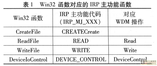 在Windows中,應用程序與WDM通信的實現(xiàn)過程:應用程序應先獲得設備句柄GUID碼,然后利用CreateFile函數(shù)打開設備,通過 DeviceIoControl函數(shù)傳遞控制代碼參數(shù)和WDM進行通信,包括從WDM中讀取數(shù)據(jù)和寫數(shù)據(jù)給WDM兩種情況,也可利用ReadFile從 WDM中讀取數(shù)據(jù)或用WriteFile寫數(shù)據(jù)給WDM:當下層驅動有觸發(fā)事件時,就需要Event事件通知上層軟件。當應用程序退出時,CloseHandle則關閉設備,這將產(chǎn)生對應于此設備對象的相應IRP消息。這種關系如表1所列。
