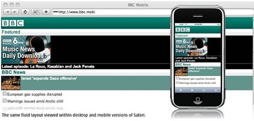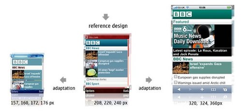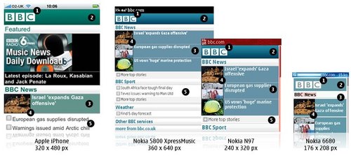 BBC還可以為特定的設備(或是一組設備)重新編排一些內(nèi)容。iPhone有非常豐富的功能,因此iPhone版的BBC還有音樂下載選項,而其他的設備可能只會顯示今天最熱門的‘BBC新聞’。可以根據(jù)數(shù)據(jù)的大小,多媒體的處理能力甚至是屏幕的尺寸決定是否需要針對iPhone提供更加豐富的內(nèi)容。以Nokia 6680上的‘特色’顯示為例,它大部分的顯示內(nèi)容是讓用戶滾動屏幕查看今天最熱門新聞故事。iPhone上顯示了三個新聞故事,而其中只有一篇配有插入。這使得用戶無需滾動屏幕就可以大致了解全部的咨詢。