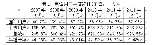 政府對電信市場的開放不僅帶來了電信產(chǎn)業(yè)的快速發(fā)展,激烈的競爭也令消費(fèi)者享受到性價(jià)比更高的服務(wù)。近幾年,電話用戶總數(shù)持續(xù)增長,從1999年的2281萬增加到2011年3月底的8億4633萬。截至2011年12月31日,電話用戶總數(shù)達(dá)到9億2655萬,說明從2011年4-12月期間新增用戶8022萬。其中,手機(jī)用戶數(shù)增長最為顯著,從2007年的1億6509萬增加到2011年3月的8億1160萬,2011年12月底達(dá)到8億9386萬。但是,固話用戶的數(shù)量則從2007年的4077萬減少到2011年3月的3473萬,到2011年12月僅有3269萬。(見表1)