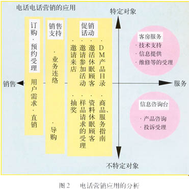 ——圖2表示以電話營銷的目的及對象為軸分析電話營銷的應(yīng)用。縱軸為對象,分為“特定”和“不特定”,橫軸為目的,分為“服務(wù)”和“銷售”。這樣右上區(qū)域=“特定對象X服務(wù)”,即為客戶服務(wù),右下區(qū)域=“不特定對象X服務(wù)”,對應(yīng)信息咨詢;左側(cè)為銷售。從對象來看,服務(wù)更偏重于“特定對象”。從目的來看,訂購/預(yù)約受理是最直接的銷售行為,所以放在最左,銷售支持在中間,促銷活動(dòng)靠右。