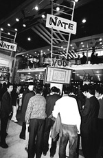韓國(guó)移動(dòng)通信運(yùn)營(yíng)商SK電訊的展臺(tái)是整個(gè)展會(huì)上最熱鬧的地方之一,能歌善舞的韓國(guó)藝人吸引了很多觀眾駐足。在“為人類(lèi)的移動(dòng)互聯(lián)通信, SK電訊與您攜手”的主題下,SK電訊展示了移動(dòng)增值及移動(dòng)互聯(lián)服務(wù)。