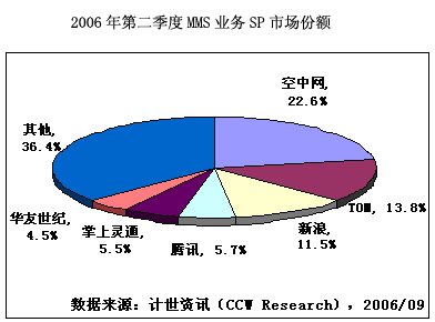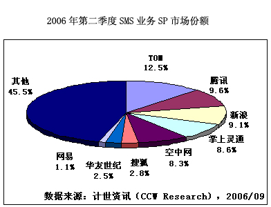 計(jì)世資訊(CCW Research)調(diào)研顯示。2006年第二季度,中國SMS業(yè)務(wù)市場規(guī)模達(dá)到118.3億元人民幣,其中SP收入12.1億元人民幣。TOM、騰訊和新浪排名前三位,分別占12.5%、9.6%和9.1%。其次為掌上靈通和空中網(wǎng),占8.6%和8.3%。