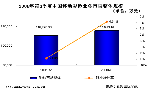研究表明,2006年第3季度,CRBT業(yè)務(wù)略有反彈。其中移動彩鈴業(yè)務(wù)的分帳前信息費(fèi)接近16000萬元,較上個季度小幅度反彈2.6%。但是總體上仍然呈現(xiàn)徘徊態(tài)勢,并沒有走出低級飽和區(qū)。