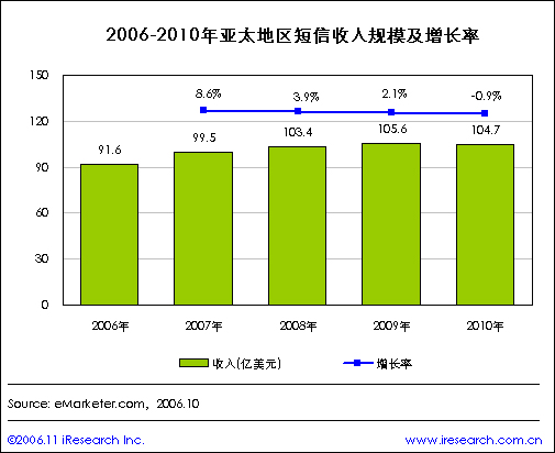 iResearch艾瑞市場咨詢整理eMarketer的相關(guān)數(shù)據(jù)顯示,2006年亞太地區(qū)短信收入將達(dá)到91.6億美元,2007年預(yù)計短信收入為99.5億美元,比2006年增長8.6%,2008年短信收入將達(dá)到103.4億美元,比2007年增長3.9%;2009年的短信收入預(yù)計為105.6億美元。預(yù)計到2010年亞太地區(qū)短信收入將達(dá)到104.9億美元,比2009年增長2.1%.