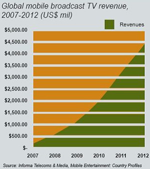 根據(jù)市場(chǎng)研究公司Informa Telecoms &Media的調(diào)查數(shù)據(jù)顯示,移動(dòng)電視市場(chǎng)在韓國、意大利和美國市場(chǎng)帶動(dòng)下,將在2007年達(dá)到美金2.19億元;至2012年,移動(dòng)電視市場(chǎng)預(yù)計(jì)能產(chǎn)生美金44億元的收益,而美國將成為最大的單一市場(chǎng),占有全球20%的收益。Informa甚至認(rèn)為在2009年,美國就可超越韓國,成為移動(dòng)電視最大的單一市場(chǎng)。