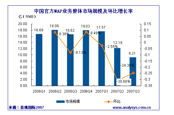易觀國際研究表明,2007年第3季度中國官方WAP市場規(guī)模達(dá)到9.21億人民幣,同比下降44.57%。中國移動(dòng)WAP頁面“資費(fèi)提醒”政策對市場的影響已得到控制,與2季度WAP市場規(guī)模逐月遞減現(xiàn)象相比,2007年7月、8月、9月WAP市場規(guī)模呈現(xiàn)穩(wěn)步增長趨勢。中國聯(lián)通WAP市場規(guī)模為1.065億元,同比下降47.55%,自中國聯(lián)通四月份改實(shí)收結(jié)算后,信息費(fèi)一直呈現(xiàn)下降趨勢。