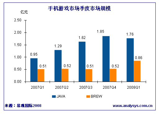 2008年第1季度中國(guó)JAVA/BREW手機(jī)游戲市場(chǎng)規(guī)模達(dá)2.61億人民幣