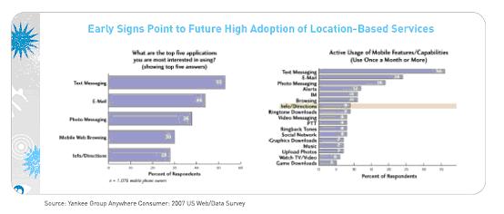 當(dāng)美國聯(lián)邦通信委員會(FCC)在2001年強制要求實施911增強功能時,移動行業(yè)就開始通過將導(dǎo)航服務(wù)引入大眾市場來獲利。7年后,絕大多數(shù)手機都集成了GPS功能,幾大主要的移動運營商也都計劃在年內(nèi)推出至少一項基于GPS 的導(dǎo)航應(yīng)用。揚基集團認為,2008年正在成為美位置服務(wù)的轉(zhuǎn)折點。