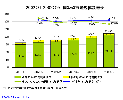 08Q3中國短信市場(chǎng)規(guī)模將繼續(xù)保持增長(zhǎng),非點(diǎn)對(duì)點(diǎn)業(yè)務(wù)下滑放緩