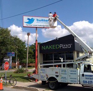 繼華爾街日?qǐng)?bào)、紐約時(shí)報(bào)、英國衛(wèi)報(bào)等報(bào)紙利用起Twitter后,最近,據(jù)Techcrunch網(wǎng)站消息稱,美國新奧爾良名為NakedPizza的比薩店,不僅在Twitter上注冊(cè)了帳號(hào),而且拆除了之前標(biāo)有訂餐電話的店前廣告牌,取而代之的是一塊以Twitter為主題的新廣告牌。