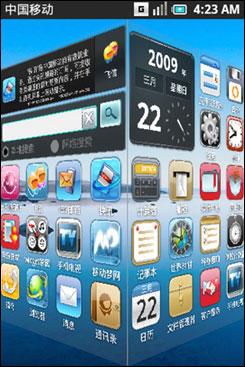 由于OMS是在基于Linux的Andriod系統(tǒng)基礎(chǔ)上,針對(duì)中國(guó)市場(chǎng)需求以及中國(guó)移動(dòng)的自有業(yè)務(wù)所做的修改,OMS操作系統(tǒng)看上去第一直觀(guān)感受仍然是與iPhone界面和T-Mobile推出的第一款A(yù)ndriod手機(jī)“Gphone”界面非常相似。