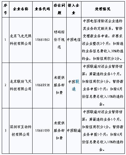據(jù)悉,這3家增值電信企業(yè)是北京飛龍無限科技有限公司,存在明碼標(biāo)價不規(guī)范問題;北京聯(lián)動飛天科技有限公司,未提供服務(wù)卻扣費(fèi);深圳市互動科技有限公司,未提供服務(wù)卻扣費(fèi)。