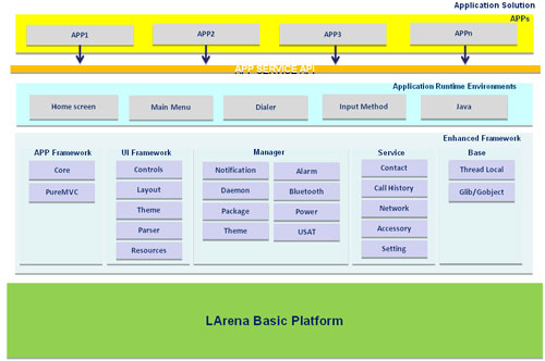 LARENA3.0是聯(lián)芯科技自主研發(fā)的高度可配置、可擴展、開放性的業(yè)內(nèi)主流手機應用平臺,它集通信、多媒體和移動互聯(lián)網(wǎng)功能于一體,實現(xiàn)了完整的應用生命周期管理和動態(tài)加載能力,充分體現(xiàn)了TD-SCDMA特有創(chuàng)新技術(shù),并支持多種業(yè)務能力,提供豐富的工具套件。