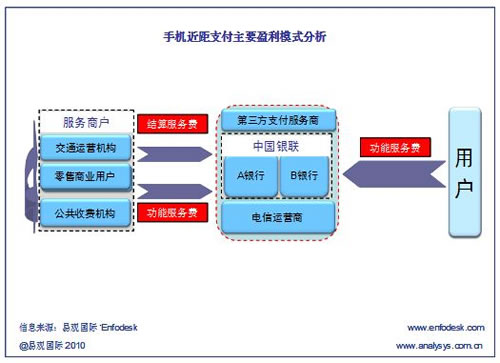 根據(jù)Enfodesk易觀智庫近期發(fā)布的《中國手機(jī)支付市場系列專題報告2010——近距支付》報告顯示,手機(jī)近距支付的主要盈利模式只有三種:即前向用戶服務(wù)費(fèi)、結(jié)算手續(xù)費(fèi)和后向商戶服務(wù)費(fèi)。