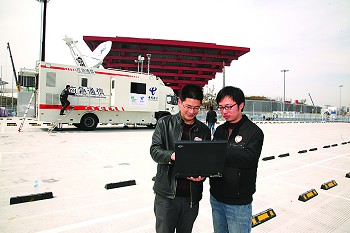 中國電信的應急衛(wèi)星通信車抵達中國館,為世博會開幕護航。