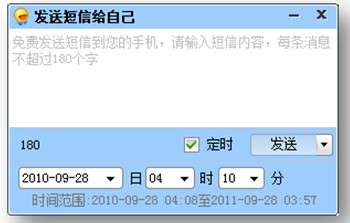 迷你飛信1.0 beta版另一大亮點(diǎn)就是類似于“移動(dòng)小秘書”的自我短信定時(shí)發(fā)送功能。用戶只需直接在好友列表或使用快捷鍵“Ctrl+Alt+W”,就打開了給自己發(fā)送定時(shí)短信的窗口。這一功能將滿足用戶通過飛信進(jìn)行“短信提醒”的使用需求。