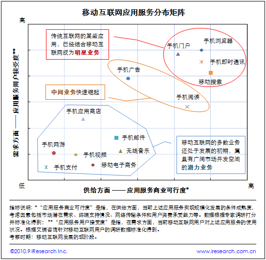 根據(jù)艾瑞咨詢近期發(fā)布的《2009-2010年中國移動互聯(lián)網(wǎng)行業(yè)發(fā)展報(bào)告》,移動互聯(lián)網(wǎng)各應(yīng)用服務(wù)在“應(yīng)用服務(wù)商業(yè)可行度”和“應(yīng)用服務(wù)用戶接受度”兩個維度上被劃分為“明星業(yè)務(wù)”、“中間業(yè)務(wù)”和“潛力業(yè)務(wù)”三個類型。具備一定規(guī);l(fā)展市場條件,但還面臨若干限制因素的移動互聯(lián)網(wǎng)業(yè)務(wù),將在未來逐步打開市場。