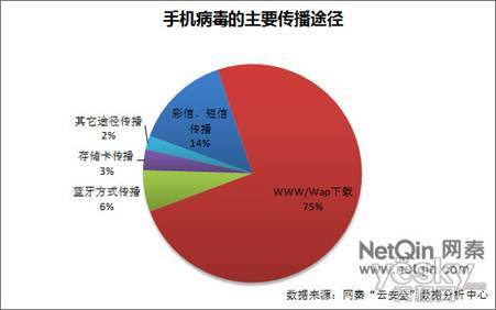 感染途徑方面,《2010年中國(guó)大陸地區(qū)手機(jī)安全報(bào)告》指出,據(jù)網(wǎng)秦“云安全”數(shù)據(jù)分析中心統(tǒng)計(jì),當(dāng)前通過(guò)手機(jī)訪問(wèn)wap和www網(wǎng)站感染病毒的比率達(dá)75%;通過(guò)短信、彩信感染病毒的比率占14%;通過(guò)藍(lán)牙傳輸方式感染病毒的比率占6%;通過(guò)存儲(chǔ)卡等途徑感染病毒的比率占3%;另外2%的用戶(hù)則是被其它傳播途徑的病毒感染。其中聯(lián)網(wǎng)感染病毒的機(jī)率最大,成為用戶(hù)面臨的最主要威脅。