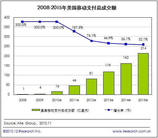 艾瑞咨詢根據(jù)Aite Group發(fā)布的數(shù)據(jù)發(fā)現(xiàn),2010年美國(guó)移動(dòng)支付總成交金額預(yù)估值為16億美元,預(yù)計(jì)2015年這一數(shù)字將攀升至214億美元,將是2010年的13.4倍,復(fù)合年增長(zhǎng)率為68%。長(zhǎng)期以來(lái),美國(guó)移動(dòng)支付總成交額一直處于被低估的狀態(tài),但它的實(shí)際表現(xiàn)遠(yuǎn)比預(yù)想要好很多。其中,2010年到2011年增長(zhǎng)率將高達(dá)187%。