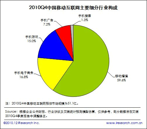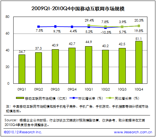 根據艾瑞咨詢即將發(fā)布的2010年第四季度中國移動互聯(lián)網市場監(jiān)測數據顯示,2010Q4中國移動互聯(lián)網市場整體規(guī)模達到51.1億,同比增長19.8%,環(huán)比增長20.3%。艾瑞咨詢分析認為,本季度電信運營商對計費通道治理開始收尾,移動增值市場整體復蘇。同時手機電子商務、手機游戲業(yè)務領域取得良好市場表現(xiàn),受手機應用商店、位置簽到服務等新型手機業(yè)務創(chuàng)新的帶動,移動互聯(lián)網規(guī)?傮w攀升,投融資比重增加。