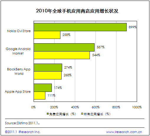 iResearch艾瑞咨詢整理Distimo最新公布數據發(fā)現(xiàn),2010年全球手機應用商店免費應用大幅增長。數據表明,諾基亞Ovi Store免費應用增長速度最快,增長率為899%,谷歌Android Market和RIM的BlackBerry App World次之,增長率分別為587%和274%.
