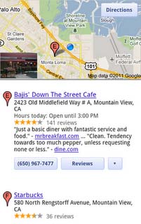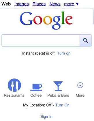 谷歌更新了移動(dòng)搜索用戶界面。用戶移動(dòng)設(shè)備屏幕的下方增添了諸如餐館、咖啡店、酒吧等圖標(biāo),并增添了一個(gè)“更多”的圖標(biāo)。如果用戶點(diǎn)擊這些圖標(biāo),可以查詢用戶所在地的各種商店的信息。而且這些商店的營(yíng)業(yè)場(chǎng)所還將會(huì)在地圖上顯示出來(lái)。