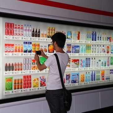 這種虛擬商店消費模式如今正漂洋過海而來,北京移動此前就曾推出過麥當(dāng)勞電子兌換單服務(wù),用戶可以通過短信接收二維碼,再去麥當(dāng)勞門店掃描兌現(xiàn)。而細(xì)心的申城用戶如今也能在軌交過道中發(fā)現(xiàn)這樣的虛擬百貨商店廣告,這些燈箱廣告中出現(xiàn)了超市中才能見到的商品貨架,五顏六色的商品圖案讓人仿佛置身于大型超市一樣,但只有當(dāng)你走近才會發(fā)現(xiàn)“貨架”竟然是“貼”在墻上的,從零食到衣服,甚至還有尿片,這里每一種產(chǎn)品下方都有相應(yīng)價格和二維碼。