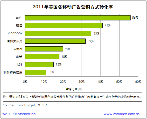 iResearch艾瑞咨詢整理ExactTarget調(diào)研數(shù)據(jù)時發(fā)現(xiàn):2011年在驅(qū)動美國手機用戶產(chǎn)生購買的移動廣告營銷方式中,電子郵件營銷的轉(zhuǎn)化率最高,達(dá)到56%,短信、Facebook、購物類手機應(yīng)用(如Amazon、eBay、Groupon)以41%、35%、32%的轉(zhuǎn)化率依次位居二、三、四位。