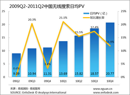 從無線搜索市場的PV來看,2011年第2季度中國無線搜索市場日均PV已經(jīng)突破24億次,環(huán)比上季度增長為11.0%,增長率相比上個季度開始反彈。