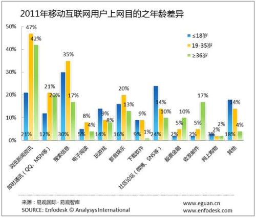 從年齡角度來(lái)看,19-35歲的用戶瀏覽新聞、資訊和即時(shí)通訊是手機(jī)上網(wǎng)的主要目的,35歲以上用戶使用移動(dòng)互聯(lián)網(wǎng)的首要目的是瀏覽新聞資訊,即時(shí)通訊需求相較低于35歲用戶銳減。19歲以下用戶最主要使用移動(dòng)互聯(lián)網(wǎng)目的在于即時(shí)通訊,其次在于玩游戲。