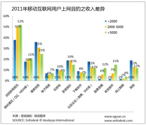 對(duì)于不同收入的用戶,其上網(wǎng)目的也有一定程度的不同,隨著收入的上升,瀏覽新聞資訊的需求明顯增加,即時(shí)通訊需求有所下滑,同時(shí)5000元以上收入的用戶對(duì)股票金融、收發(fā)郵件的需求有顯著提升。