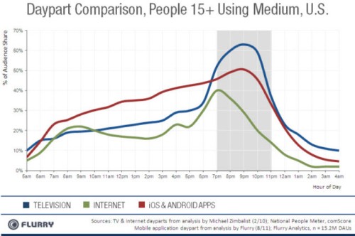 移動分析公司Flurry的一項最新研究表明,和電視節(jié)目有黃金收視時段一樣,移動應(yīng)用也有黃金使用時段,晚上7點(diǎn)左右是用戶使用移動應(yīng)用的頂峰期。