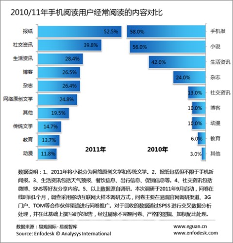 易觀國際(Analysys International)分析認(rèn)為之所以微博、SNS等社交資訊在手機閱讀用戶經(jīng)常閱讀的內(nèi)容分類中超過小說主要有以下兩個原因: