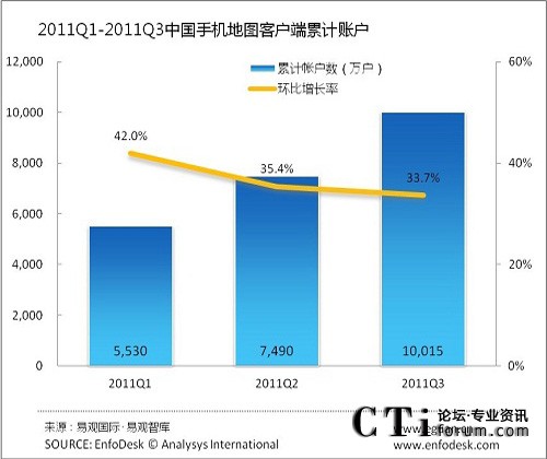 2011年第3季度中國(guó)手機(jī)地圖客戶端累計(jì)帳戶過億