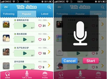 Talk Jokes是一款輕量級(jí)語(yǔ)音笑話分享應(yīng)用,鼓勵(lì)用戶通過(guò)真人錄音的方式上傳和分享自己的笑話,專注于“講笑話”的這部分語(yǔ)音垂直市場(chǎng)。
