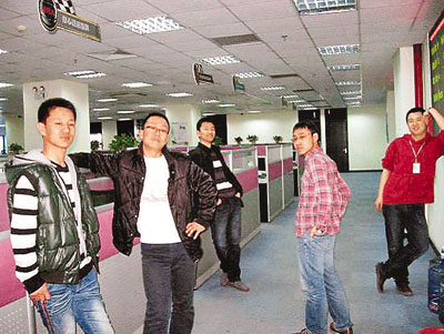 圖:李明磊(左一)與同事們堅(jiān)守在呼叫中心的崗位上 想多賺錢(qián)助姐結(jié)婚
