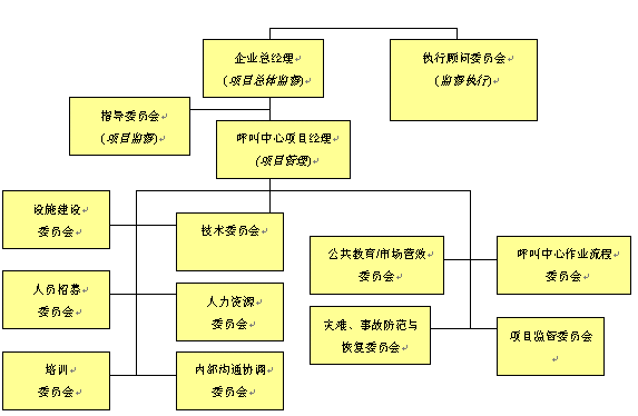 。。對于呼叫中心建設(shè)項目實施的規(guī)劃是一個需要付出巨大心血與努力的階段,這個階段需要企業(yè)或組織機構(gòu)所有人員的廣泛參與和專家意見。對于呼叫中心運營的規(guī)劃,相對與呼叫中心建設(shè)項目而言則顯得有些"特殊",它意味著整個呼叫中心建設(shè)項目團隊不可能有全部的時間花費在運營規(guī)劃議題上。因此,我們可以將全部項目規(guī)劃工作與任務(wù)拆分成若干個規(guī)劃細項,這將保證有較強的可操作性。我們建議采取的方式是將整個項目實施規(guī)劃團隊拆分成負責各個專項實施的小組委員會或附屬委員會。這些小組委員會將集中關(guān)注各自特定的項目實施上,當有需要時,與其他各小組進行交流與溝通,并在相關(guān)問題上達成一致。按照以上項目組織管理架構(gòu)其目的是,在項目實施的關(guān)鍵環(huán)節(jié)和領(lǐng)域,能產(chǎn)生出更具深度的規(guī)劃方案。這樣操作同時可以使更多的人員參與進來,并有利于增強各個小組的責任感,有助于項目的成功實施。以下的項目指導(dǎo)委員會組織架構(gòu)不是任何呼叫中心建設(shè)項目都能適用的,但是它在某種程度上已經(jīng)為呼叫中心項目規(guī)劃提出了一個基本方針,按照這個思路它將保證項目的成功實施。而對于規(guī)模較小的呼叫中心項目,以上的組織架構(gòu)成員將扮演多重角色,并負責多項任務(wù)項目的實施。就呼叫中心項目規(guī)劃與實施團隊而言,應(yīng)由若干個負責不同領(lǐng)域?qū)嵤┑男〗M來組成,以便確保呼叫中心建設(shè)項目的所有領(lǐng)域,及各個階段的有效實施。呼叫中心項目規(guī)劃與實施組織架構(gòu)請見下圖。