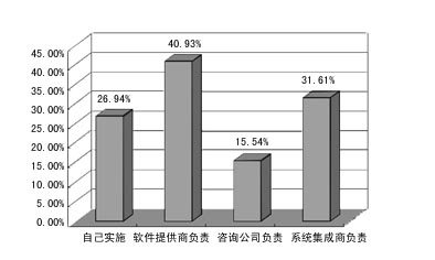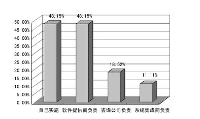 在用戶如何實施CRM系統(tǒng)的調(diào)查中,已應用CRM的單位一般都是由自己或軟件提供商負責,而沒用CRM的企業(yè)則大多期望能由軟件提供商負責。這說明,用戶實施CRM的主體意識還不夠強。