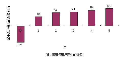 以信用卡服務(wù)為例,爭(zhēng)取一個(gè)新的用戶平均要51美圓,用于廣告、推銷和開戶等開支。用戶開始時(shí)花錢很少,但為公司帶來一定的利潤(rùn)。但如果用戶繼續(xù)使用到第二年,就會(huì)為公司帶來更多的經(jīng)濟(jì)效益,因?yàn)楣九c客戶之間的信任和客戶對(duì)公司的滿意,致使客戶更多地通過信用卡消費(fèi)。(圖:"信用卡用戶產(chǎn)生的價(jià)值")用戶貢獻(xiàn)在增加,公司的運(yùn)作費(fèi)用卻在不斷減低。信用卡公司可以不斷減少對(duì)客戶信用的審核時(shí)間。保持長(zhǎng)期的客戶關(guān)系,還可以減少?gòu)V告支出,客戶本身就是一個(gè)免費(fèi)的廣告資源。很多人在消費(fèi)前喜歡聽取朋友的意見,覺得比廣告更可信。