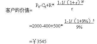 下面舉另一個(gè)例子具體說明客戶價(jià)值的計(jì)算: 假設(shè)客戶與公司保持交易時(shí)間:N=5年;公司最初吸引每個(gè)客戶的成本(營(yíng)銷費(fèi)用): C0=¥400;客戶第一次購(gòu)買的產(chǎn)品價(jià)格:P0=¥2000;公司期望每年從每個(gè)客戶處增加的收入:R=¥500;利率(一般指貸款利率): r =9%;那么客戶的價(jià)值等于:客戶初次購(gòu)買產(chǎn)品和以后幾年每年消費(fèi)價(jià)值的折現(xiàn)之和,減營(yíng)銷成本,即: