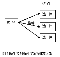 當(dāng)客戶選擇某個(gè)選件時(shí),系統(tǒng)自動(dòng)提示推薦另一選件,這種關(guān)系稱為選件的推薦關(guān)系。比如,在配置手機(jī)產(chǎn)品時(shí),選擇了某電話選件,則推薦使用特定充電器型號(hào)選件,雖然其他類(lèi)似的選件也可以適用。如圖2所示,雖然選件X可以與組件Y內(nèi)的選件Y1,Y2,Y3搭配,但推薦使用Y2。